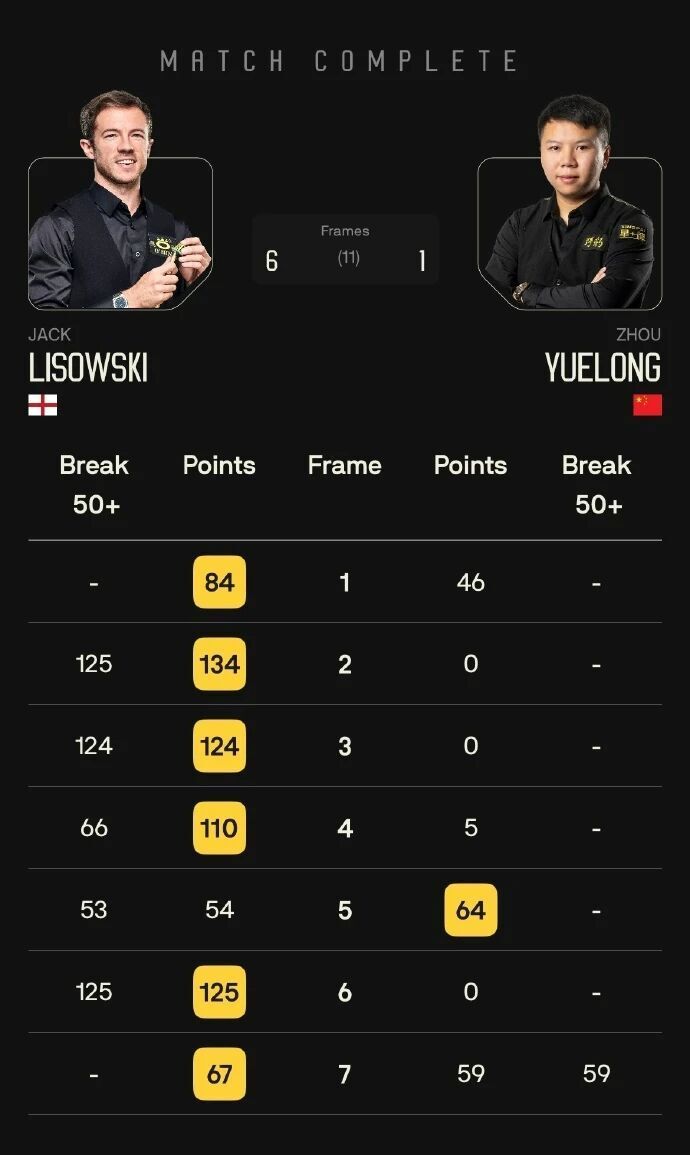 这场比赛,利索夫斯基的进攻手感不错,轰出3杆破百,但也给了周跃龙不少机会。可惜,周跃龙在攻防两端频频失误,导致大败出局。周跃龙,北爱公开赛的整体状态一般,就像上一场赢了福特后,周跃龙说自己状态不好,没手感。尽管失利,但半决赛已经是个不错的成绩了。