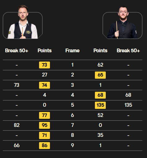 首局,特鲁姆普清黑,单局逆转。此后两人各打出一杆60+,双方战成2平。